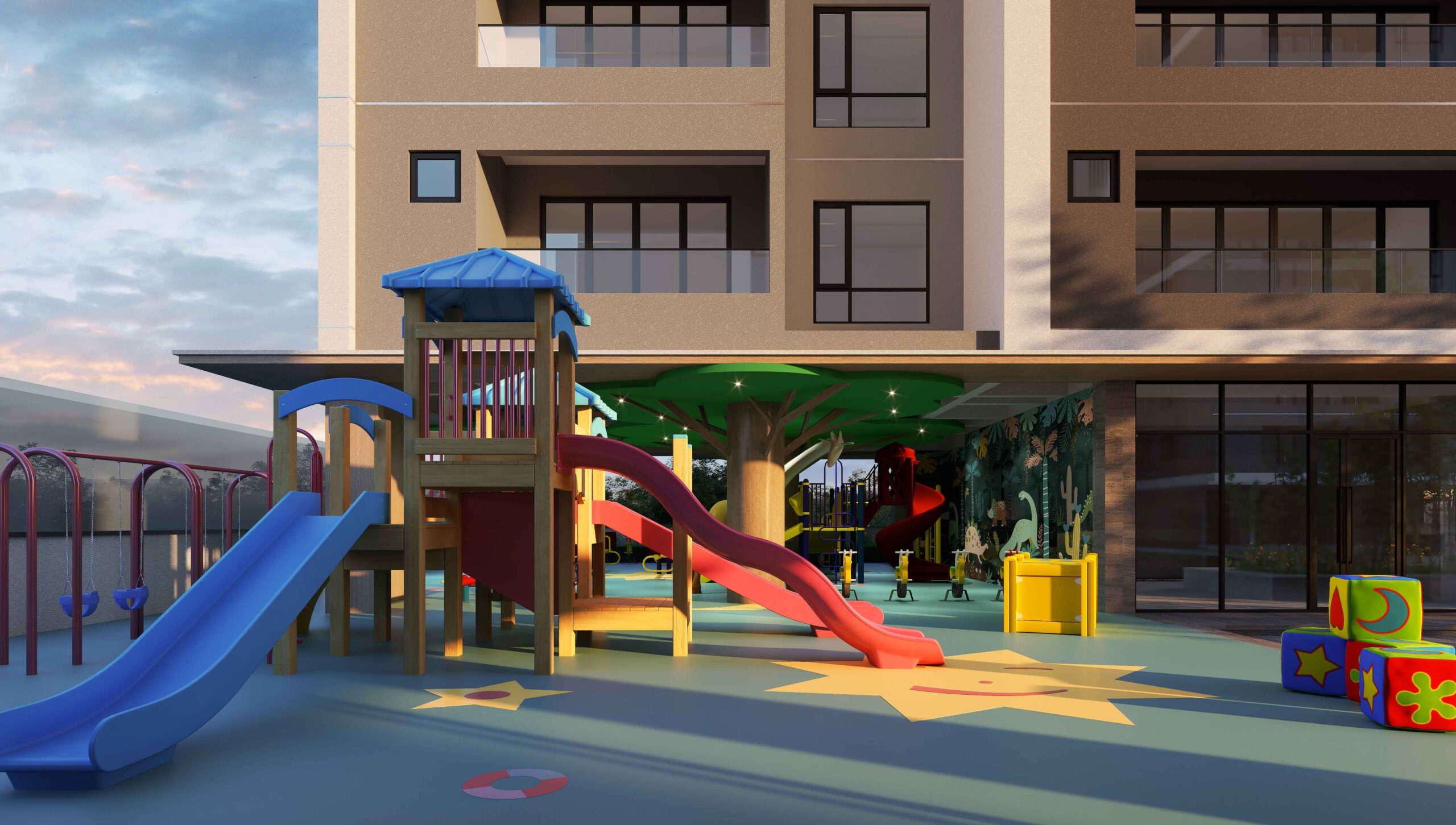 - Landscape Atrium: A 1,500-square-meter area with water features, BBQ spaces, and a secure children’s play area.